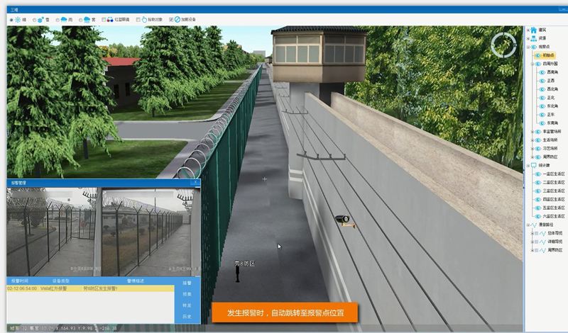 周界防范微波雷达可以控制摄像机联动,在监墙警戒线内每100米(根据现场环境选择不同型号)左右安装一台雷达,运用微波侦测原理,形成一个100米长、6米高、5度夹角的椭圆型警戒空间监视区,当可疑人员进入警戒区或者穿越警戒线时,雷达测出可疑人员距离雷达的距离、方向和速度,通过通信网络发送到后台控制中心,由控制中心解算出可疑人员距雷达的距离,运动速度和方向,并根据距离信息,控制摄像机的电动变焦镜头,从而清晰捕捉到发现可疑人员的区域情况。控制中心同时与监控中心和武警监控中心联动,将相关信息发送到主控中心,软件平台会自动弹出报警电子地图,联动视频图像,并可在多个指定的监视器上同时弹出报警位置视频画面,系统与视频监控进行联动并可将该区域监控图像到自动切换到大屏幕画面。